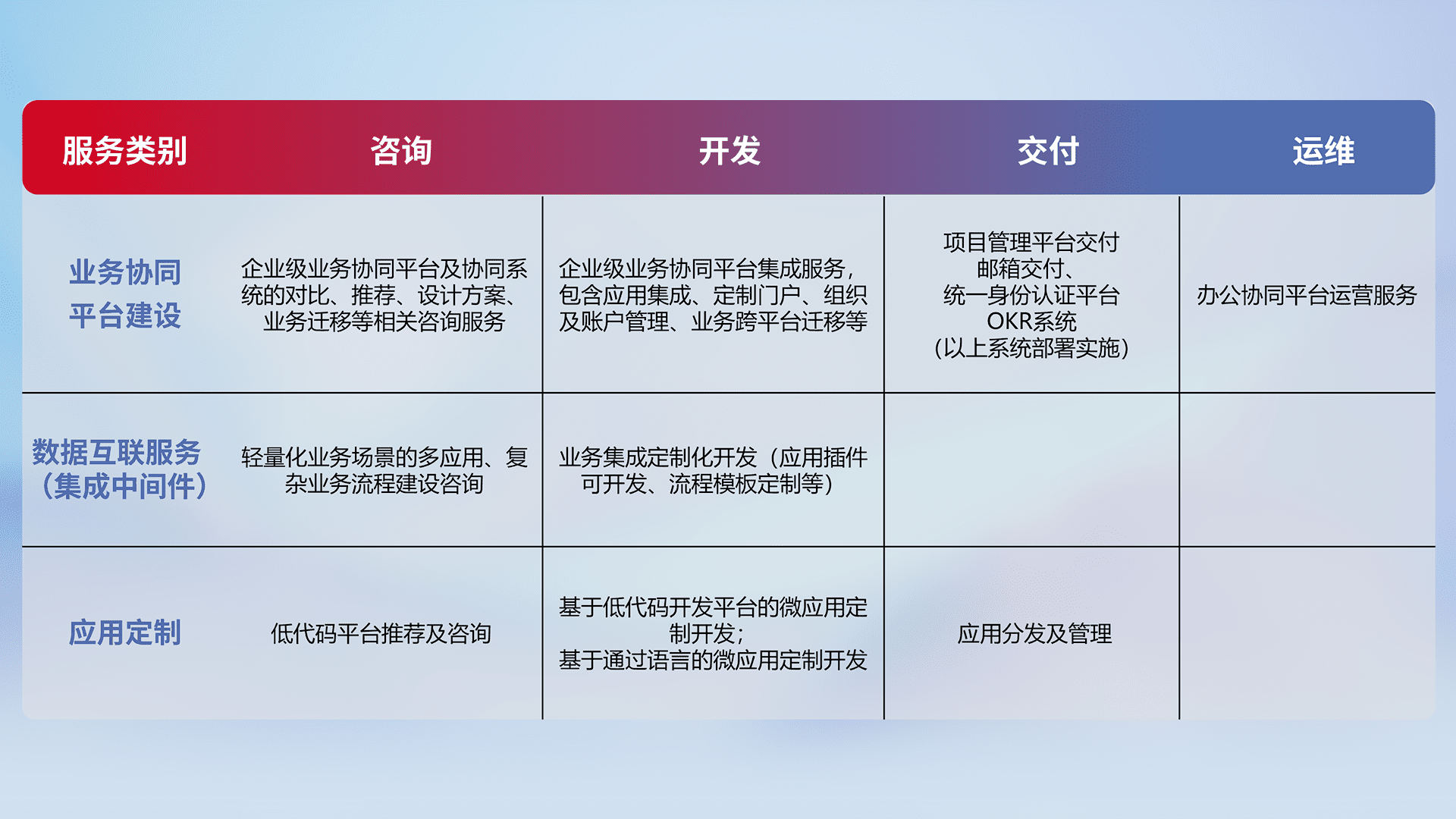 针对钉钉、、企微、、IDaas等平台级产品提供产品的规划、、、方案、、交付、、定制化开发等服务,,,,实现如统一协同办公、、、智能客户服务、、、混合会议管理、、、智能数据查询、、等业务场景,,,实现数字化转型。。。