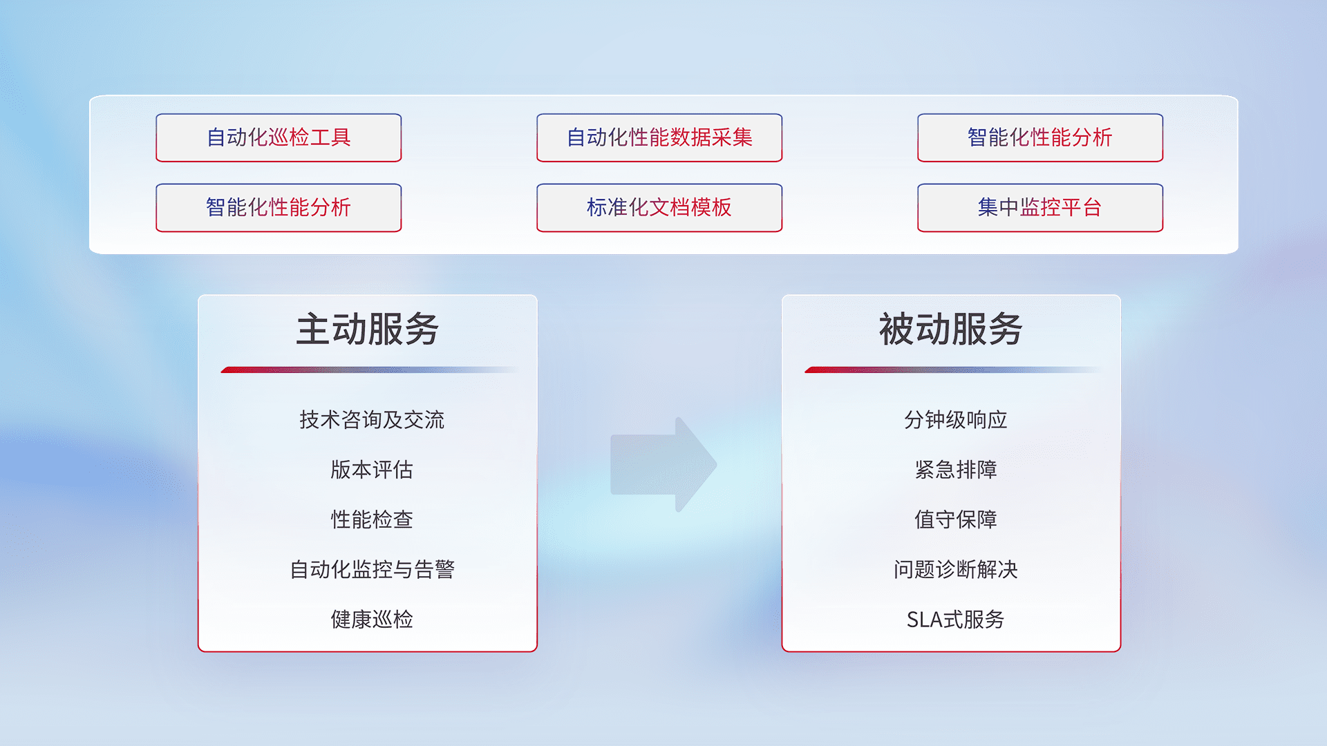 智能化工具和标准化文档,,,,保障服务质量,,提供主动服务(包含技术咨询、、、、版本评估、、、性能检查、、、、自动化监控与告警、、、健康巡检)和被动服务包含(分钟级响应、、、紧急排障、、、值守保障、、、、问题诊断解决、、、SLA服务)。。